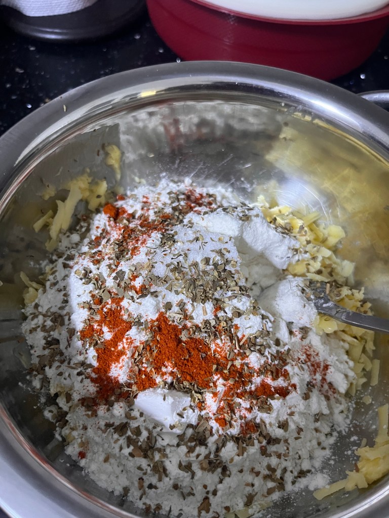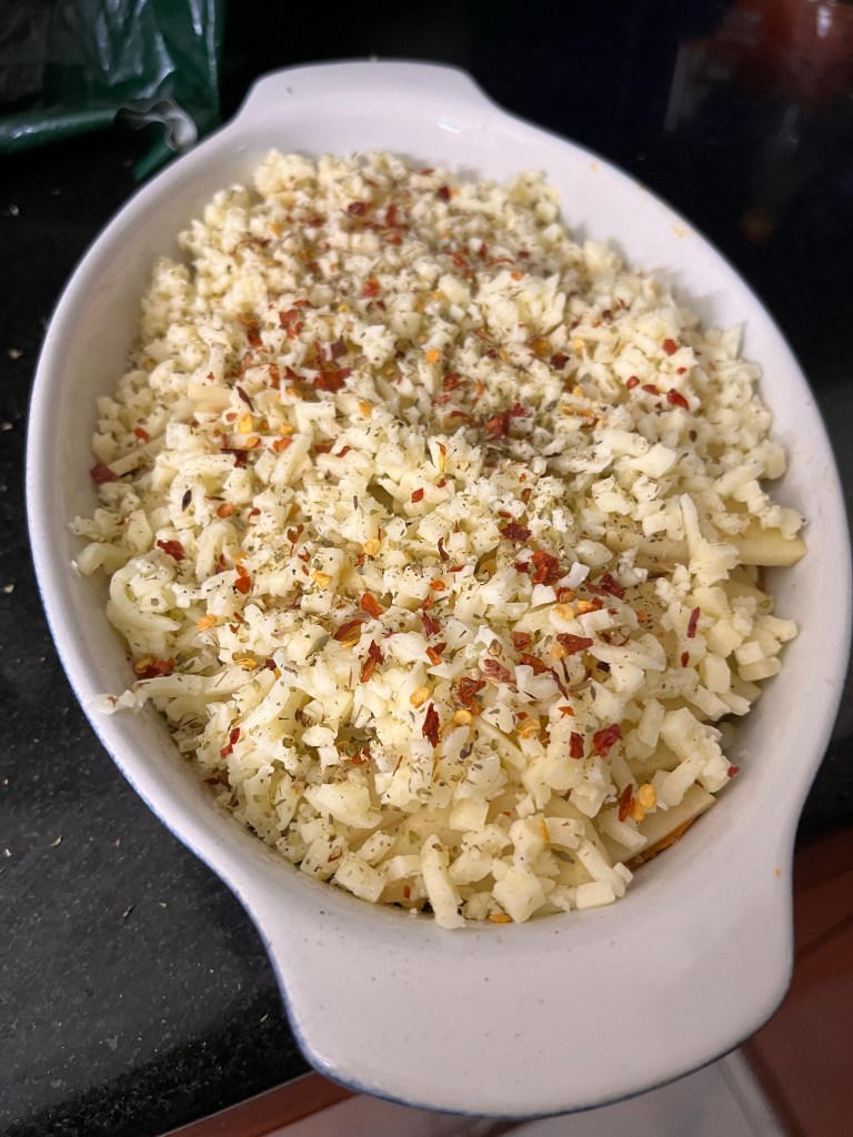 Top with the cheese and sprinkle with Italian seasoning and red chilli flakes. Bake in a preheated 180 degrees Celsius oven for 30 minutes till the cheese turns brown. Serve hot.
