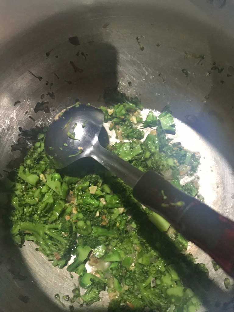 Add the flour and fry to a few seconds till the raw smell goes away. Add milk, stirring all the time. Add the puréed broccoli stems and water. Boil for four minutes.