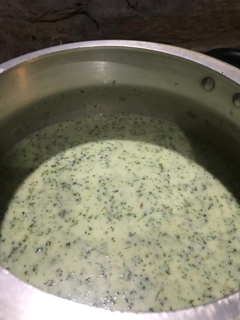 This is a light but filling soup, just right for winter. The cream and the puréed broccoli stems makes this ideal for a one-dish meal.