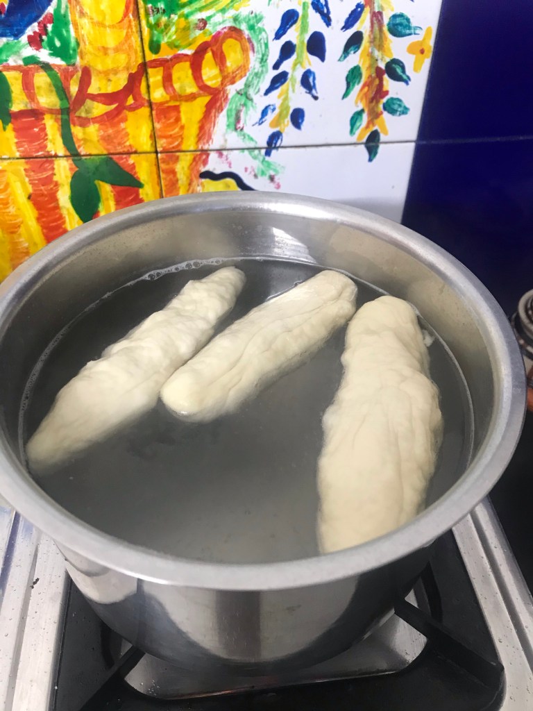 Boil water in a deep vessel and add the baking soda. Cook each dough roll in the water for 30 seconds, turning it once.