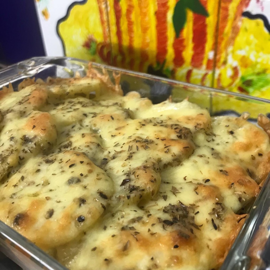 In a baking tray, pour a tablespoon of bacon grease. Arrange a layer of potato slices. Add a layer of the bacon and mushroom mixture. Add a layer of overlapping potato slices. Sprinkle a layer of cheese and Italian herbs. Add another layer of potatoes.