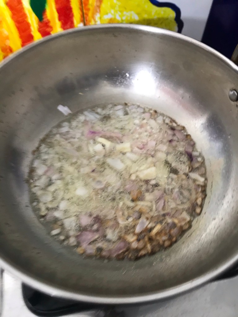 Heat the vegetable oil in a wok and add the onions. Sauté for 2-3 minutes till the onions turn golden brown.