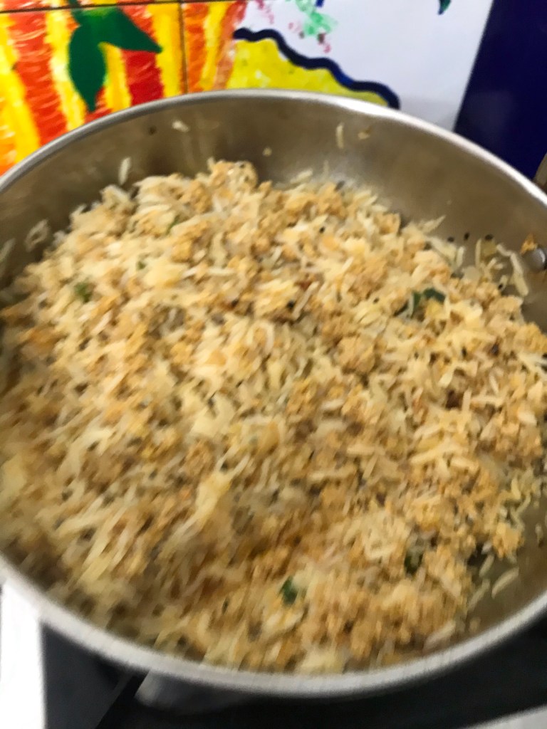Take cooked rice, basmati or any long-grained variety is best. If it is made the night before and kept in the refrigerator, it is even better. Fluff it up with a fork and keep aside.