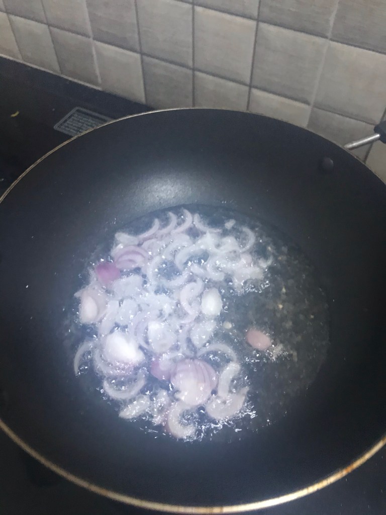 When they stop sputtering, add the two large sliced onions. Sauté till they turn transparent.