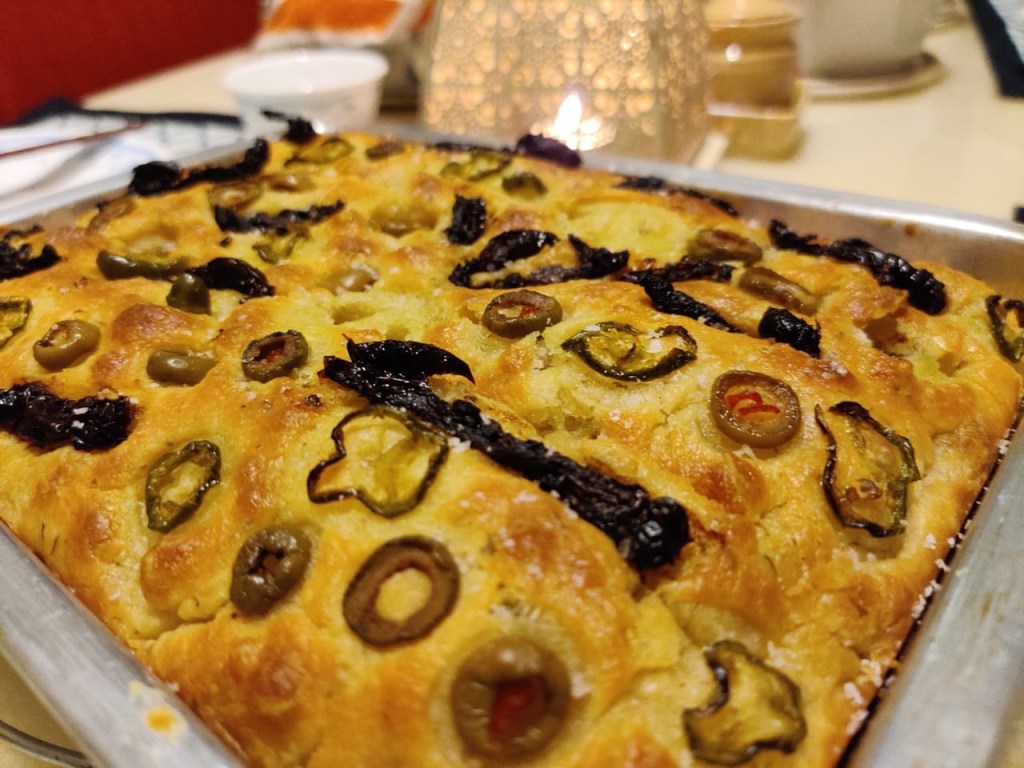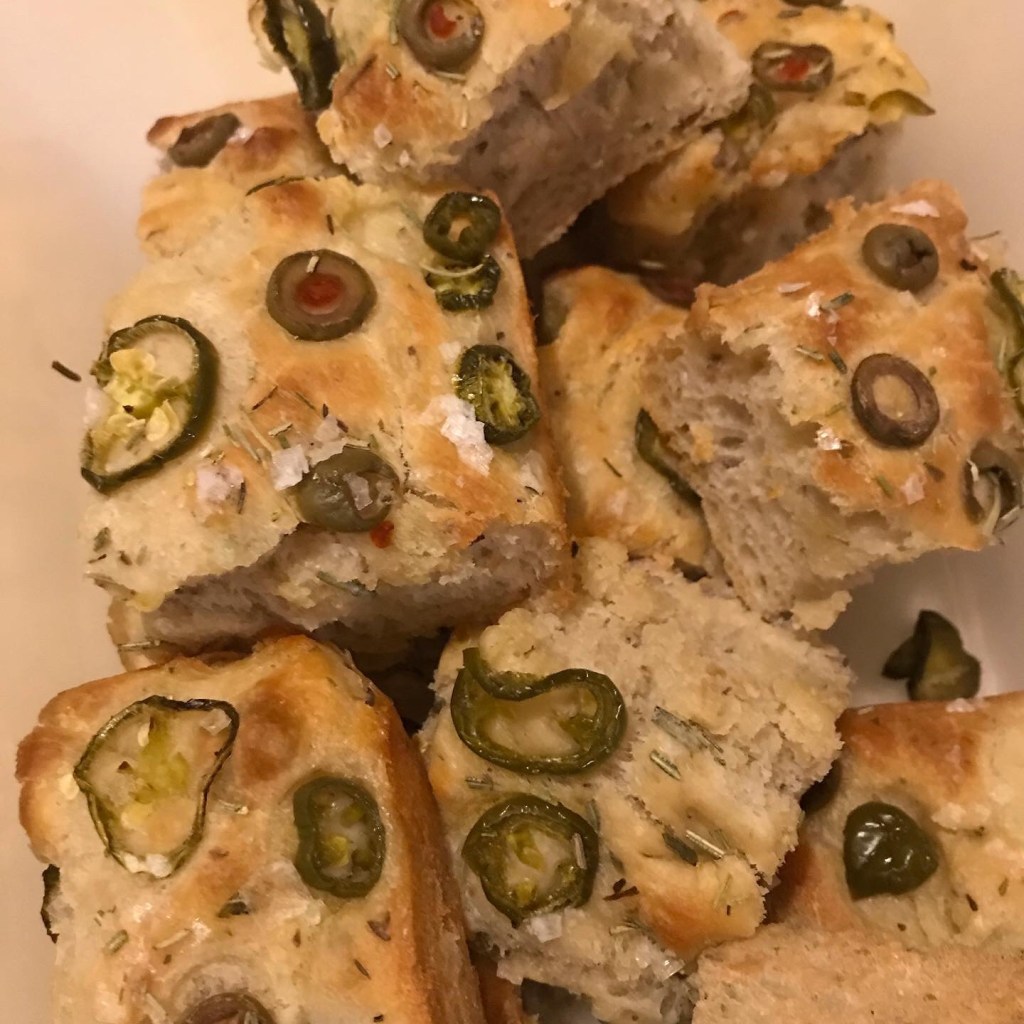 Add the olives, jalapeño peppers, 4 tablespoons of red chilli sauce, oregano and salt to the bread.