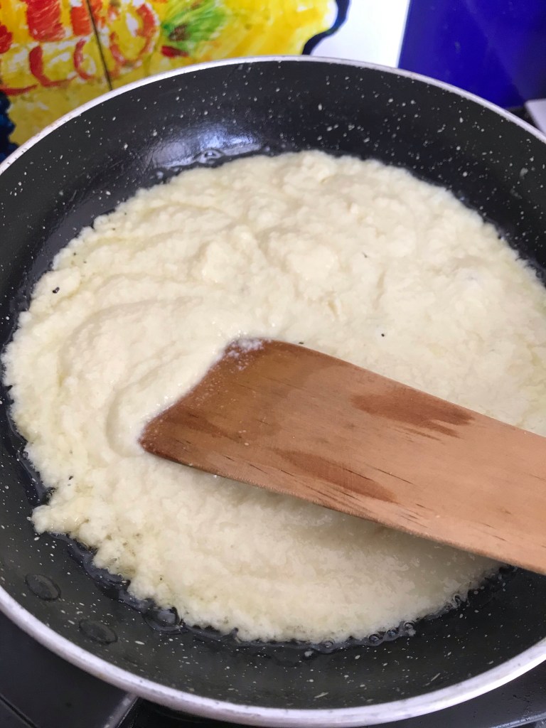 When all the water is absorbed and the mixture begins to leave the sides of the pan, transfer to a greased dish. To test if the sweet is ready, put some on a plate. If you are able to roll it off easily, it is ready.