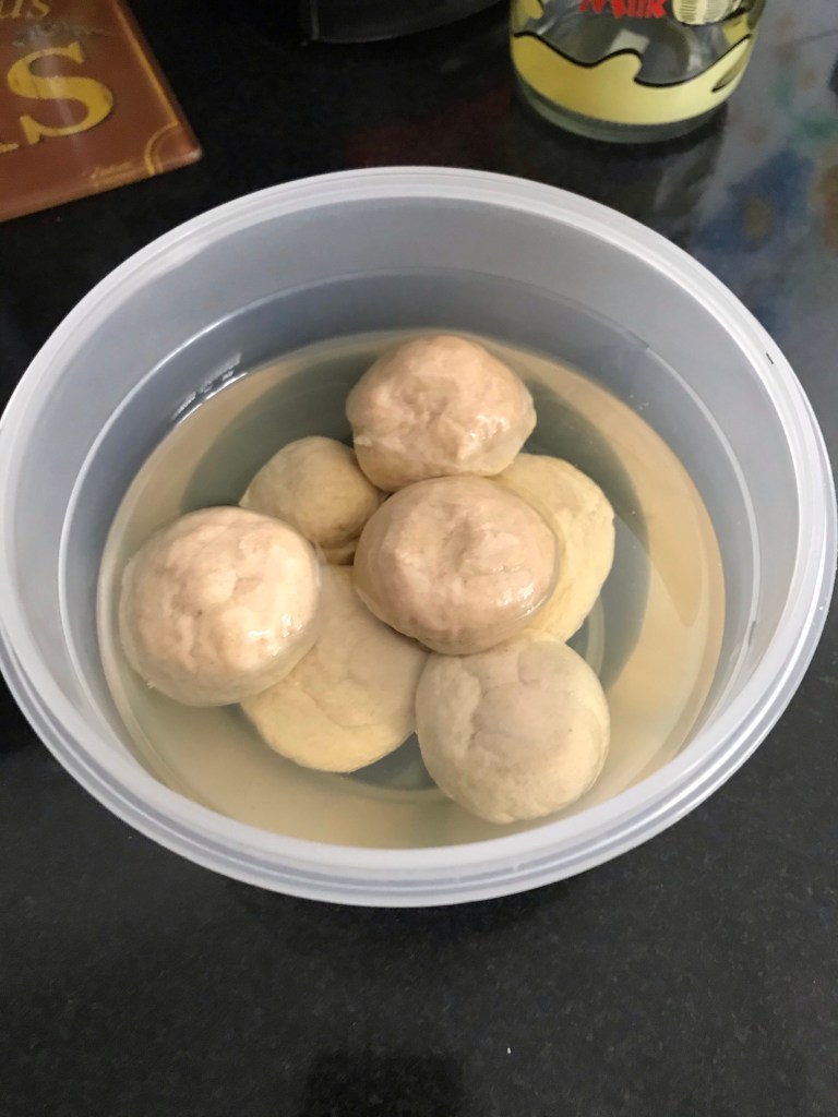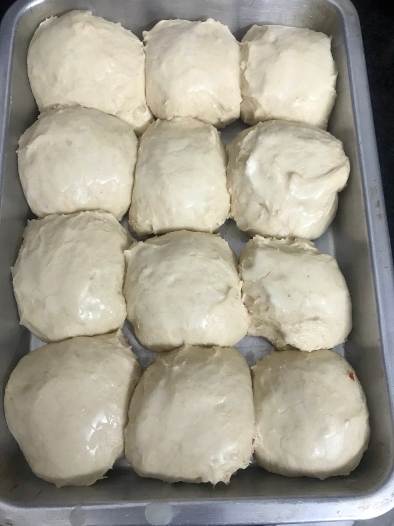 Bake in a 180 degree C oven for 20 minutes. Brush the hot buns with melted butter. Let them cool in the tray.