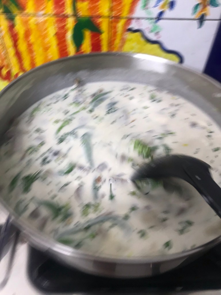 Add the cream and let the bubbles appear. Keep stirring. Switch off the heat.