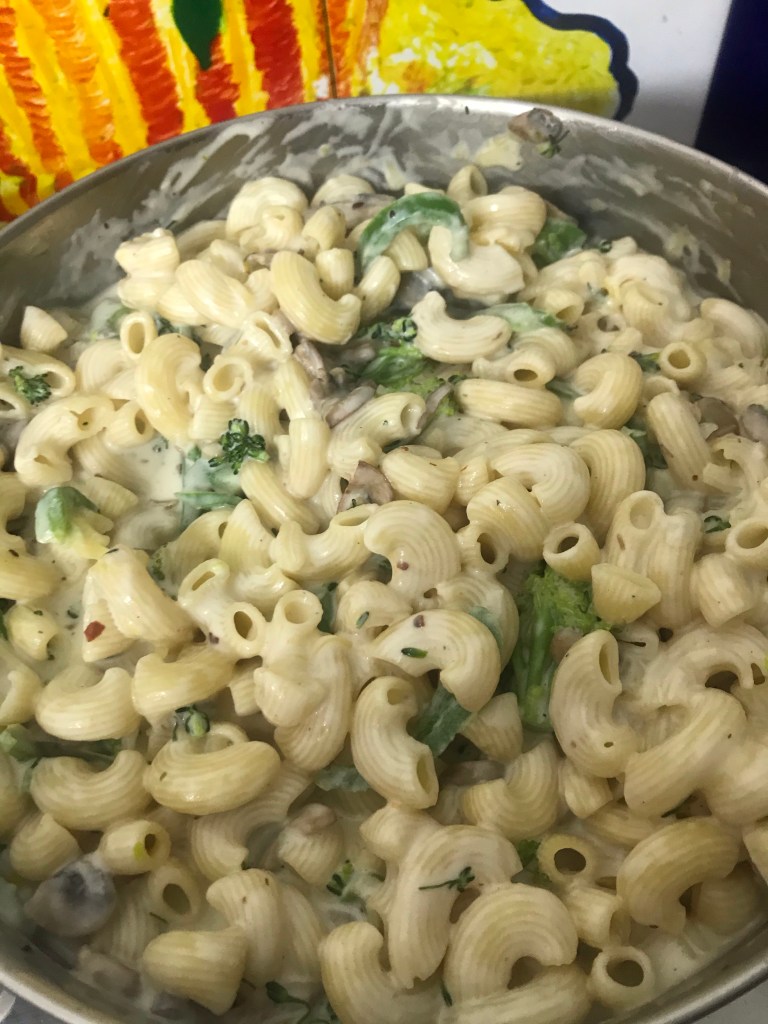 This dish with garlicky cream sauce with peperoncino flakes and aged cheddar cheese is delicious and healthy. You can use any pasta though I have used macaroni. The broccoli and capsicum give it a lovely fresh green colour.